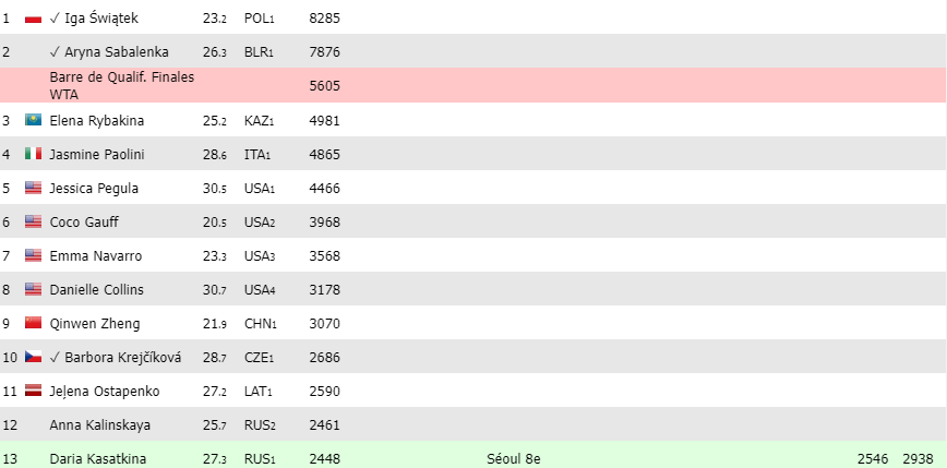 A date : Deux très bonnes élèves sont conviées à la cérémonie de clôture de l’année, Swiatek et Sabalenka. Si Rybakina se remet la tête à l’endroit, elle devrait les suivre, tout comme Paolini et Pegula. Gauff et Navarro devront se montrer sérieuses, elles ont le potentiel. Collins tient la corde mais Zheng semble davantage motivée en cette fin de saison. Krejcikova (2000 points pour sa victoire à Wimbledon) et les suivantes (Kasatkina ?) vont devoir redoubler d’efforts au risque de ne même pas être remplaçantes.