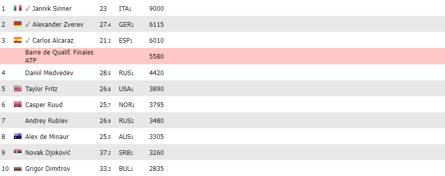 A date : les élèves Sinner, Zverev et Alcaraz ont amassé assez de bons points depuis janvier pour postuler au Master. Medvedev, quoiqu’un peu dissipé parfois, devrait vite les rejoindre. Djokovic, le trublion de la classe, a déclaré que ce tournoi n’était pas une priorité. Il s’en fout il l’a déjà gagné 7 fois. Dimitrov va devoir cravacher pour rattraper ses camarades.