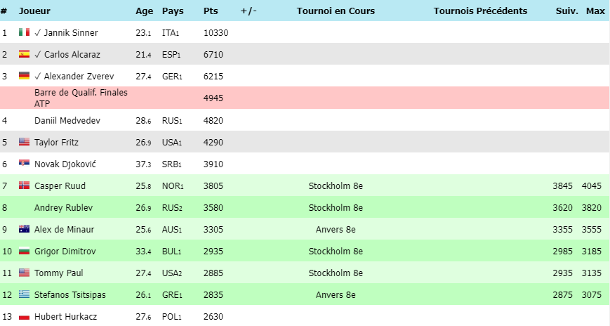 Un delta de quasi 1200 points entre Ruud, 7ème et Hurkacz 13ème qui ressemble au grand canyon. Vu l’état de forme de tout ce petit monde, les positions pourraient bien se figer alors qu’il y a 1750 points à aller chercher au maximum.
